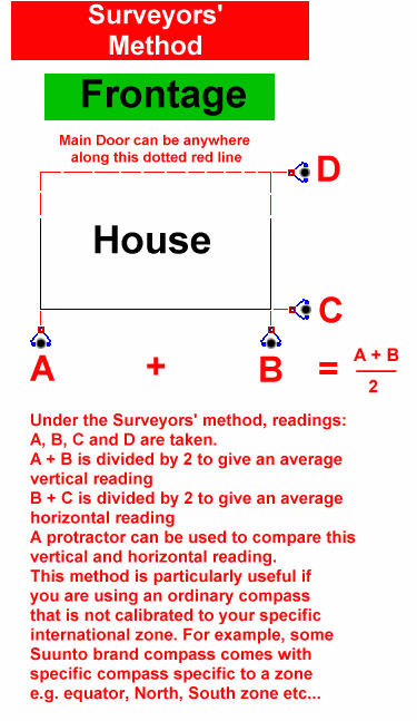Take a compass reading from Point A to B. This will give you a compass reading of the Wall where your main door is located. Asumming that the degree you take is 88 Degree as in the diagram above.